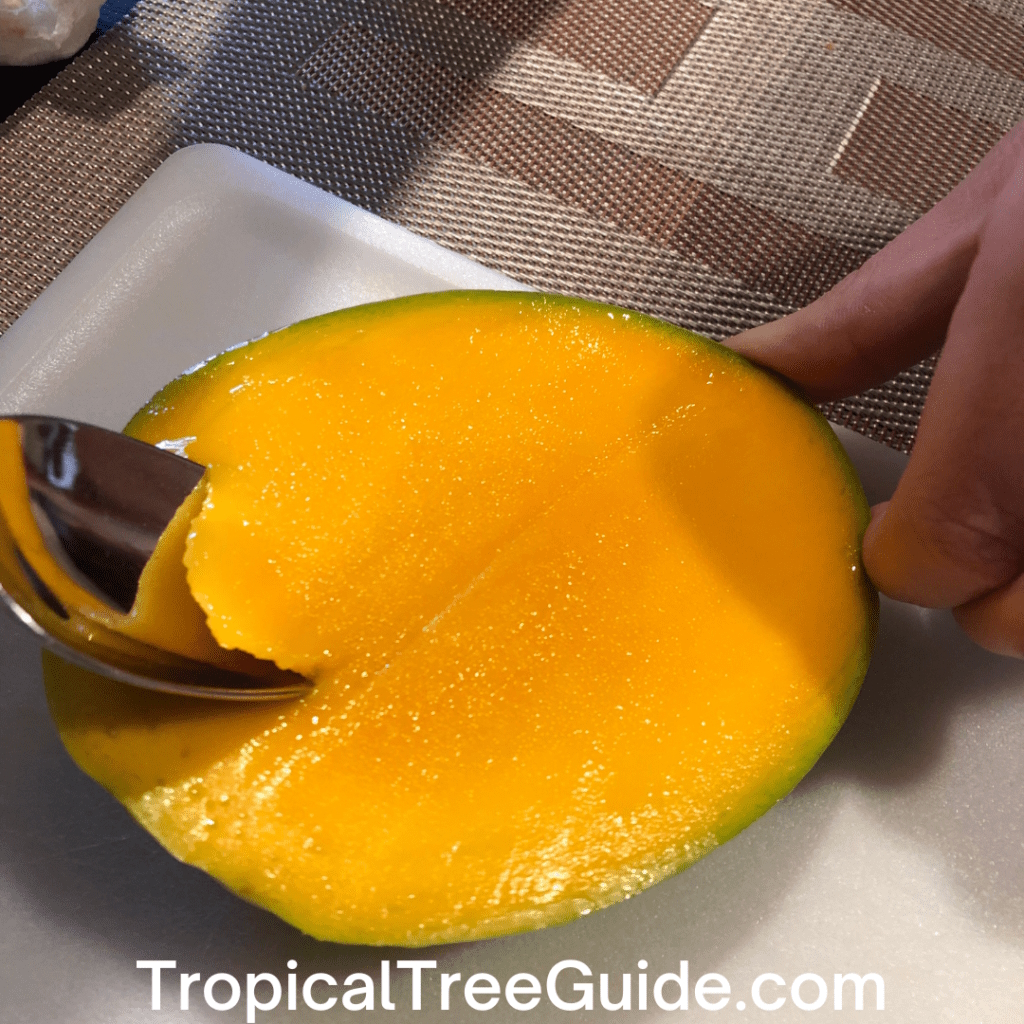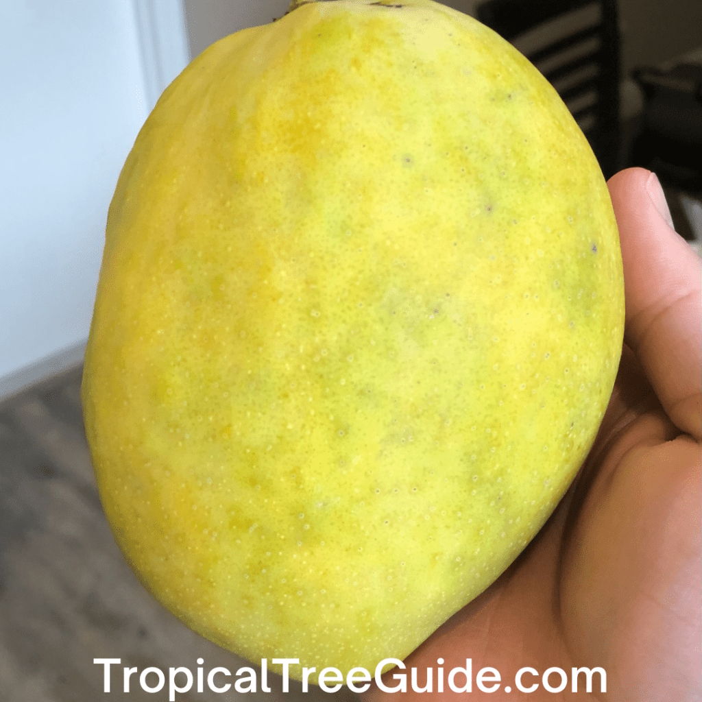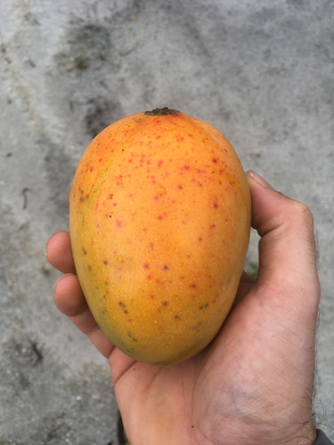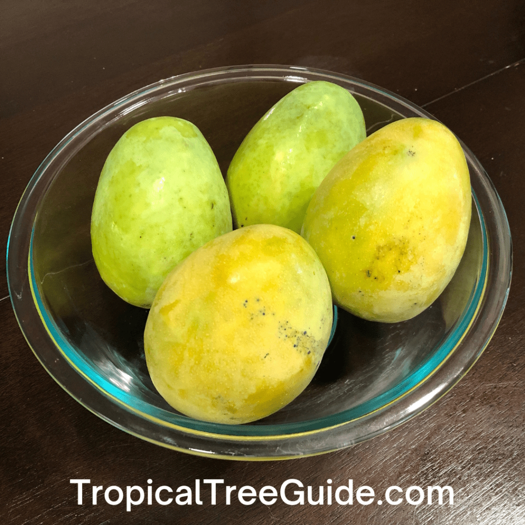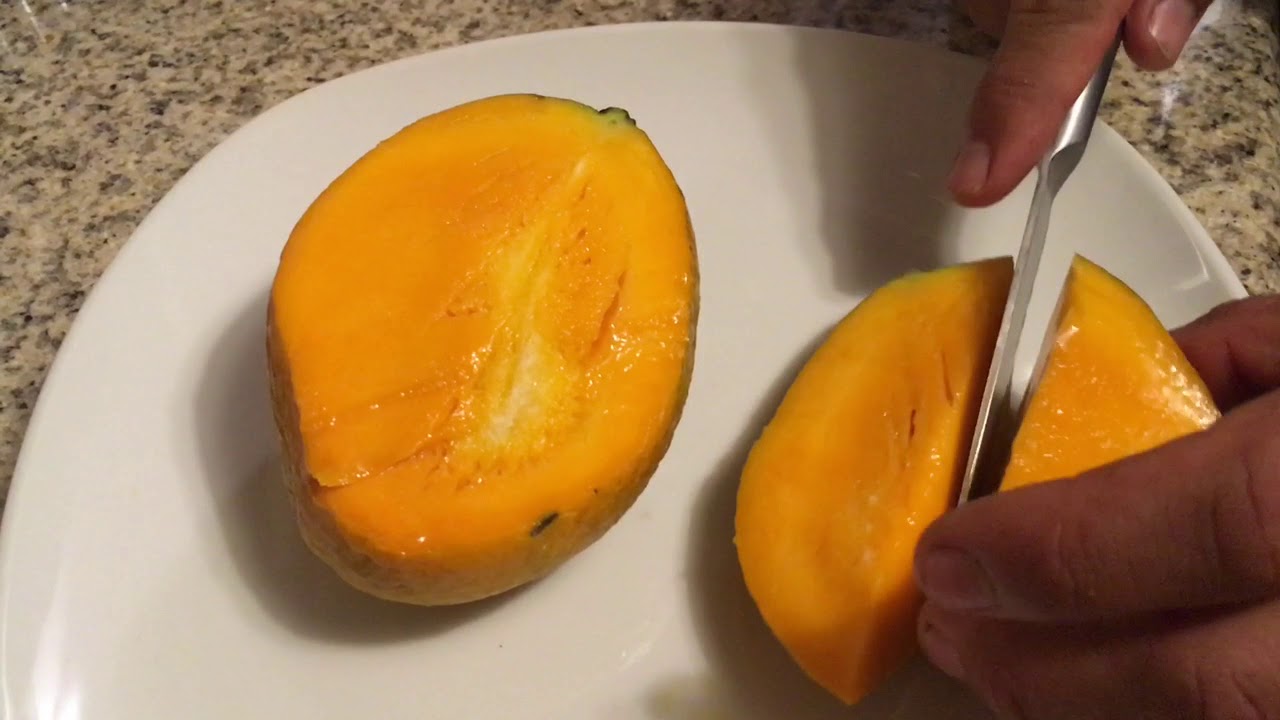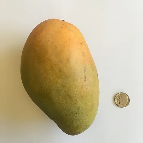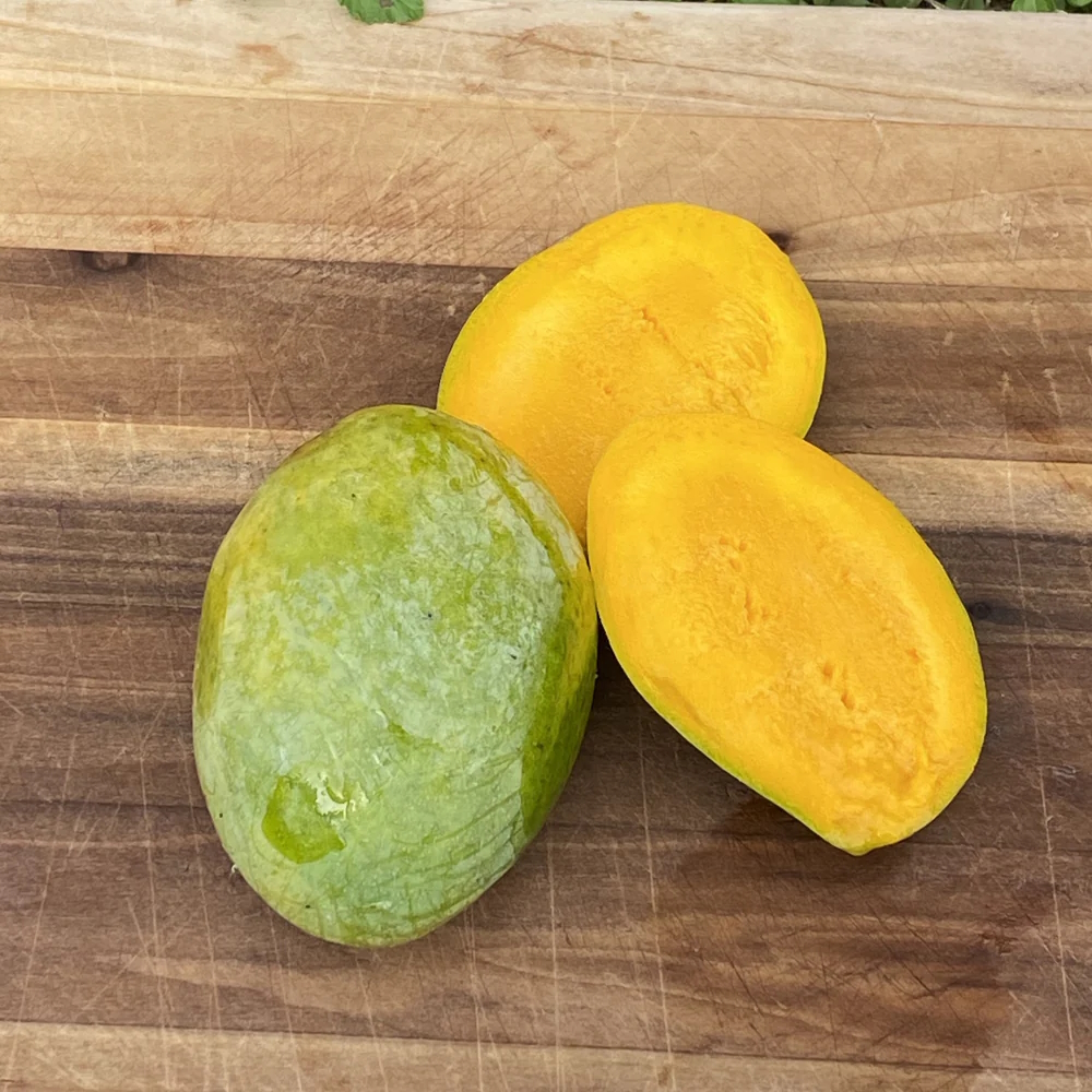 The fruit is small, averaging a pound or less, and ripens from June to July in Florida. At maturity it may be green to yellow, but the fruit doesn’t develop red blush like other mangoes. The flesh is not fibrous, is orange and rich in flavor with a strong aroma, and contains a monoembryonic seed. The fruit are highly resistant to fungus.