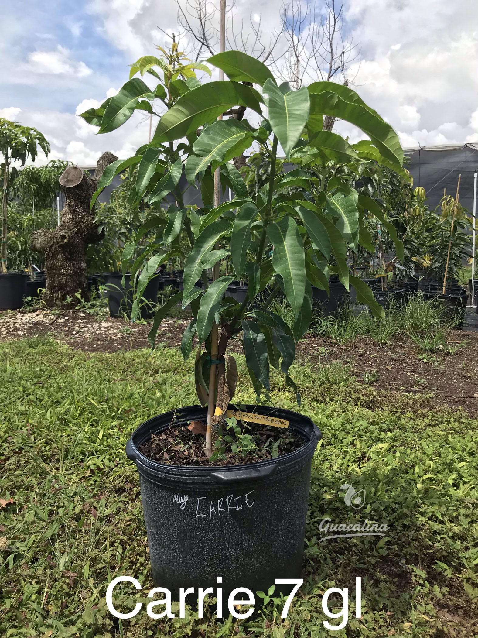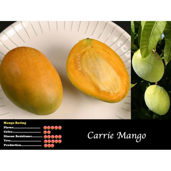The original tree was grown on the property of Laurence H. Zill in Boynton Beach, Florida and was reportedly a seedling of the ‘Sophie Fry’ mango. A pedigree analysis of the Florida mangoes conducted in 2005 that did not include Sophie Fry instead the study found Julie to be the most likely parent, though Julie is also the parent of Sophie Fry. The Carrie tree was named after Lawrence Zill’s mother, Carrie Zill. It first fruited in 1940 and commercial propagation began in 1949. Thereafter Carrie gained a reputation for having excellent eating qualities and good disease resistance. Its commercial application was limited due to the fruit’s lack of color and soft flesh, but it became a popular dooryard variety in Florida.