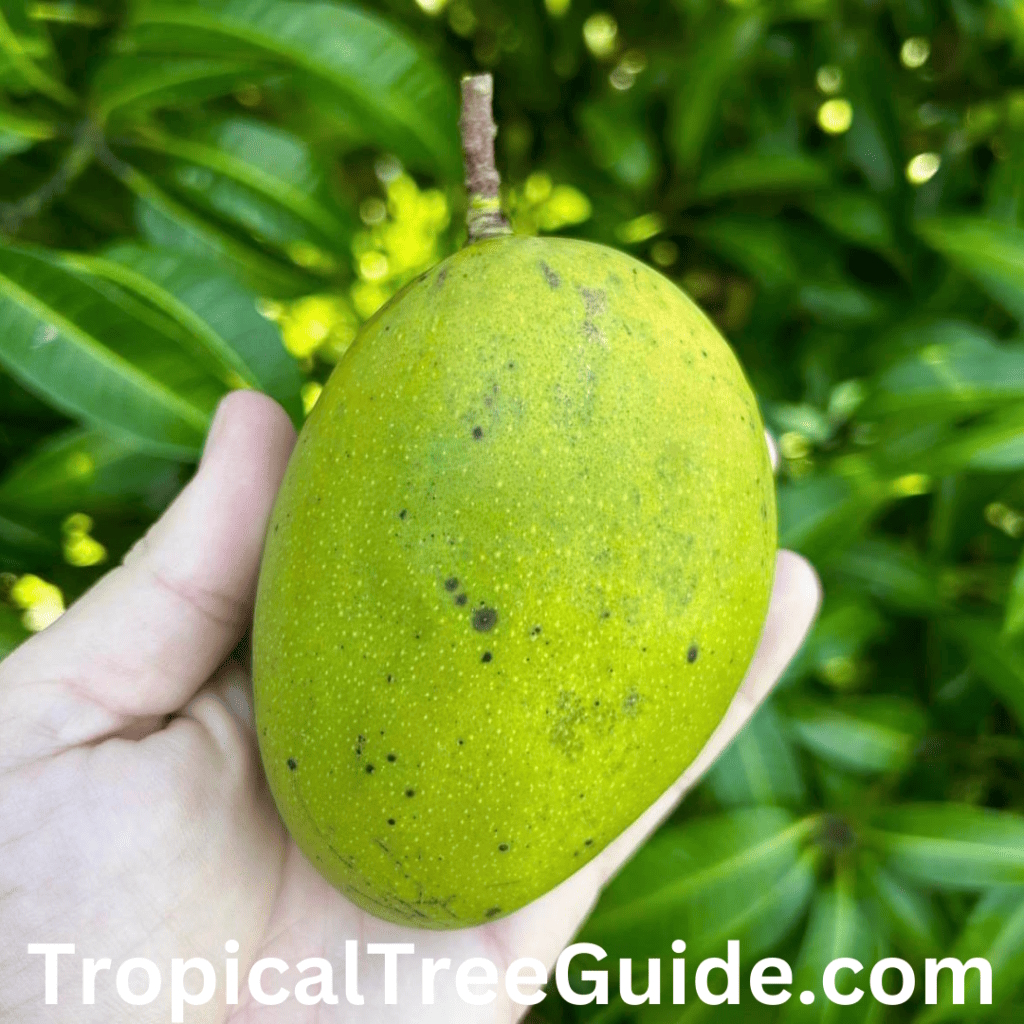 The trees can be vigorous growers, but their compact growth habit makes them easy to manage. They have dense, rounded canopies. The leaves are distinctive for being somewhat wider than most mango leaves.