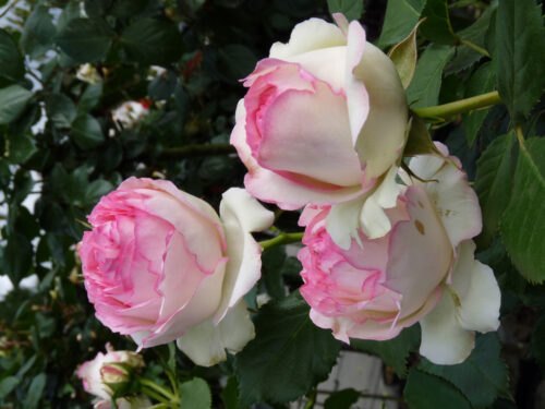 The large, old-rose type blooms are carmine-pink on the inside and cream or ivory on the outside, reaching an average diameter of 3″ (10 cm). The large flowers are very full with 55 to 60 petals. Due to their weight the cupped, globular flowers bow their heads. They have a very light to moderate tart fragrance, appear mostly solitary, open slowly and normally not fully. ‘Pierre de Ronsard’ blooms more or less continuously throughout the season, but strongest during the first flush.