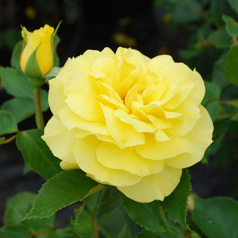 Its sunny yellow blooms are large and flat with 17 to 25 waved petals, reaching an average diameter of 8 cm (3.2 in) and have a very strong fragrance. The high-centered flowers appear solitary or in small clusters in a blooming period lasting from June to September. Their bright yellow colour hardly changes with age. The flower is not well suited as a cut flower as it has short stems and only lasts for a short period of time after cutting.