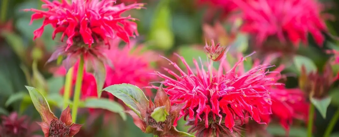 The flowers are tubular and bilaterally symmetric, with a narrow upper lip and a wider lower lip. The wild flowers are single, but some cultivated forms have double flowers. They are monoecious, with male and female structures in each flower. There are two stamens. Inflorescences occur at the top of the stem or emerge from the axils. They are typically crowded head-like clusters of flowers with leafy bracts. Flower color varies, with wild species bearing red, pink, and light purple flowers. M. didyma has bright carmine red flowers, M. fistulosa has pink, and M. citriodora and M. pectinata have pale purple. Hybrids occur in the wild, and they are common in cultivation. Seed collected from hybrids does not yield plants identical to the parent.